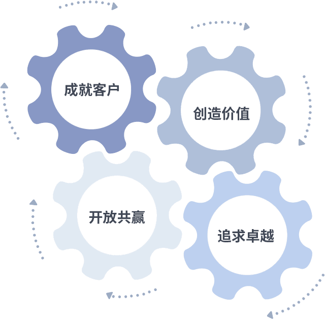 成就客户是一切决策的出发点,,,创造价值是衡量所有工作的标准,,,追求卓越是我们做事做人的态度,,开放共赢是我们的格局也是最终的结果。。。价值观的齿轮环环相扣,,推动着组织里的每个人不断向前。。。